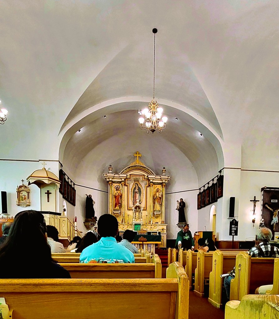 We attended mass in Spanish. Children were baptized, and the congregation celebrated. Outside, we could see the vast land of the San Luis Valley in the distance.