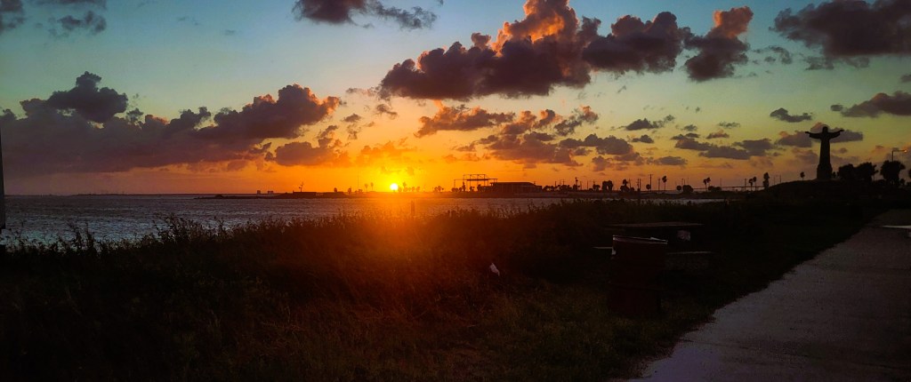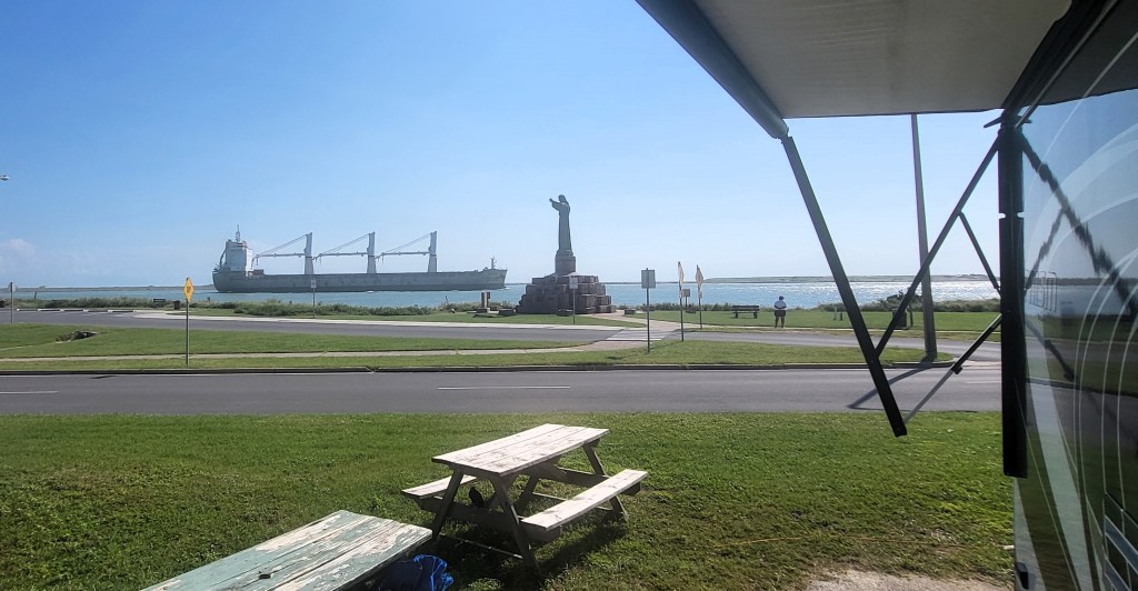 Since buying our RV, we have planned an annual pilgrimage to Isla Blanca Park every April and October. We park by Jesus Christ. “El Cristo de los Pescadores” is a statue erected to remember fishermen who perished at sea. We call these trips pilgrimages because the sea, this Christ with arms wide open, and the names of the men who lost their lives at sea invite us to reflect on our lives and be grateful for His blessings.